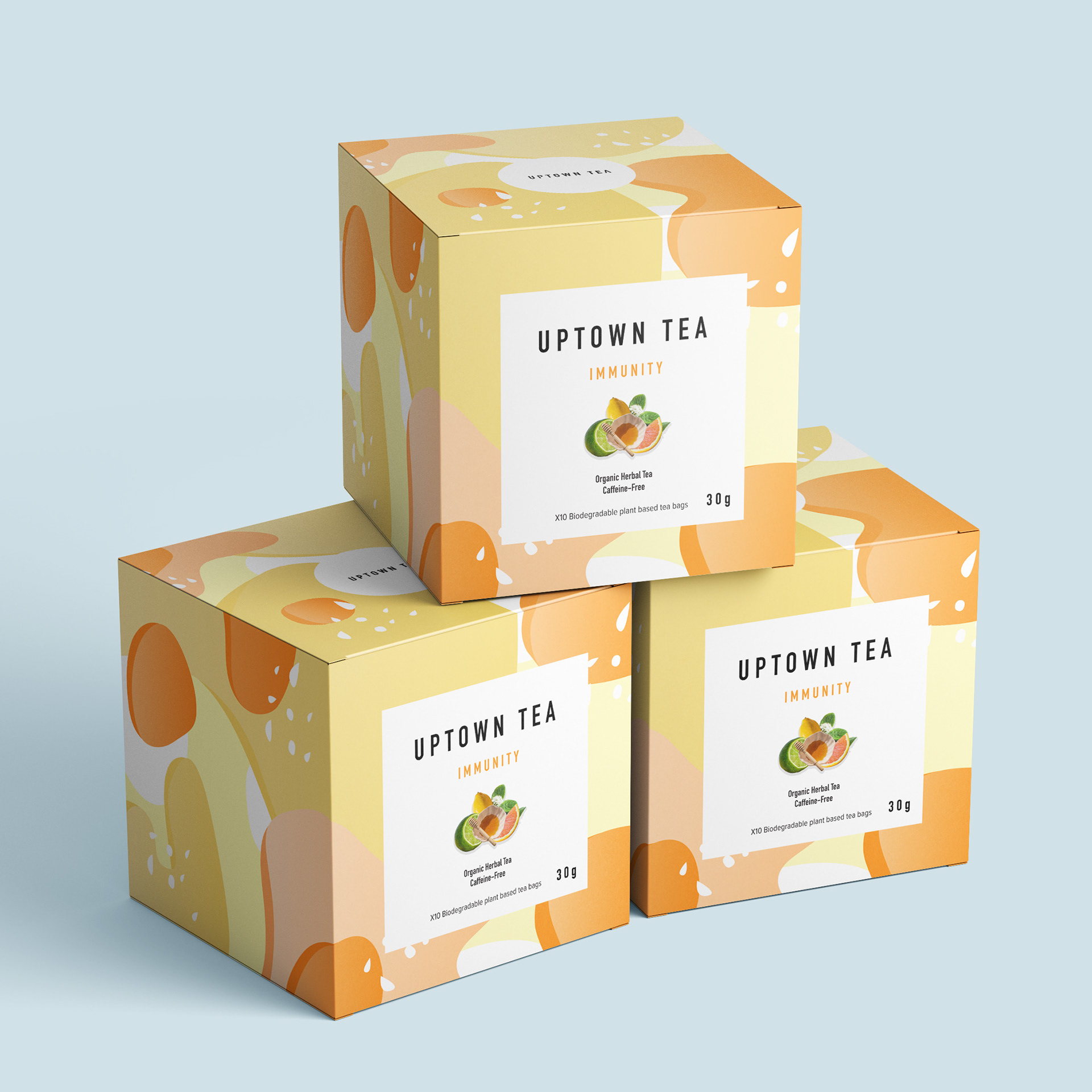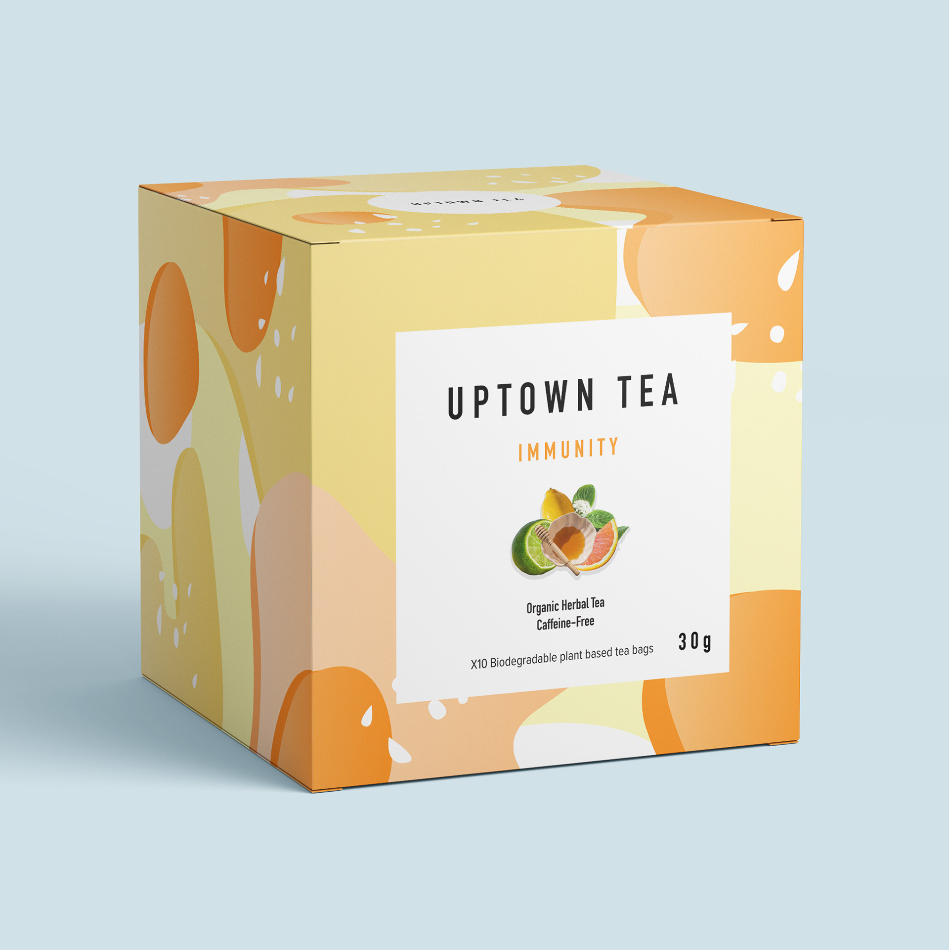 My solution involved designing immune cell-inspired shapes for the packaging, which is protecting against viruses and bacteria. Orange is often associated with wellness, health, and vitality and I have applied this colour to represent the immune boosting tea blend.