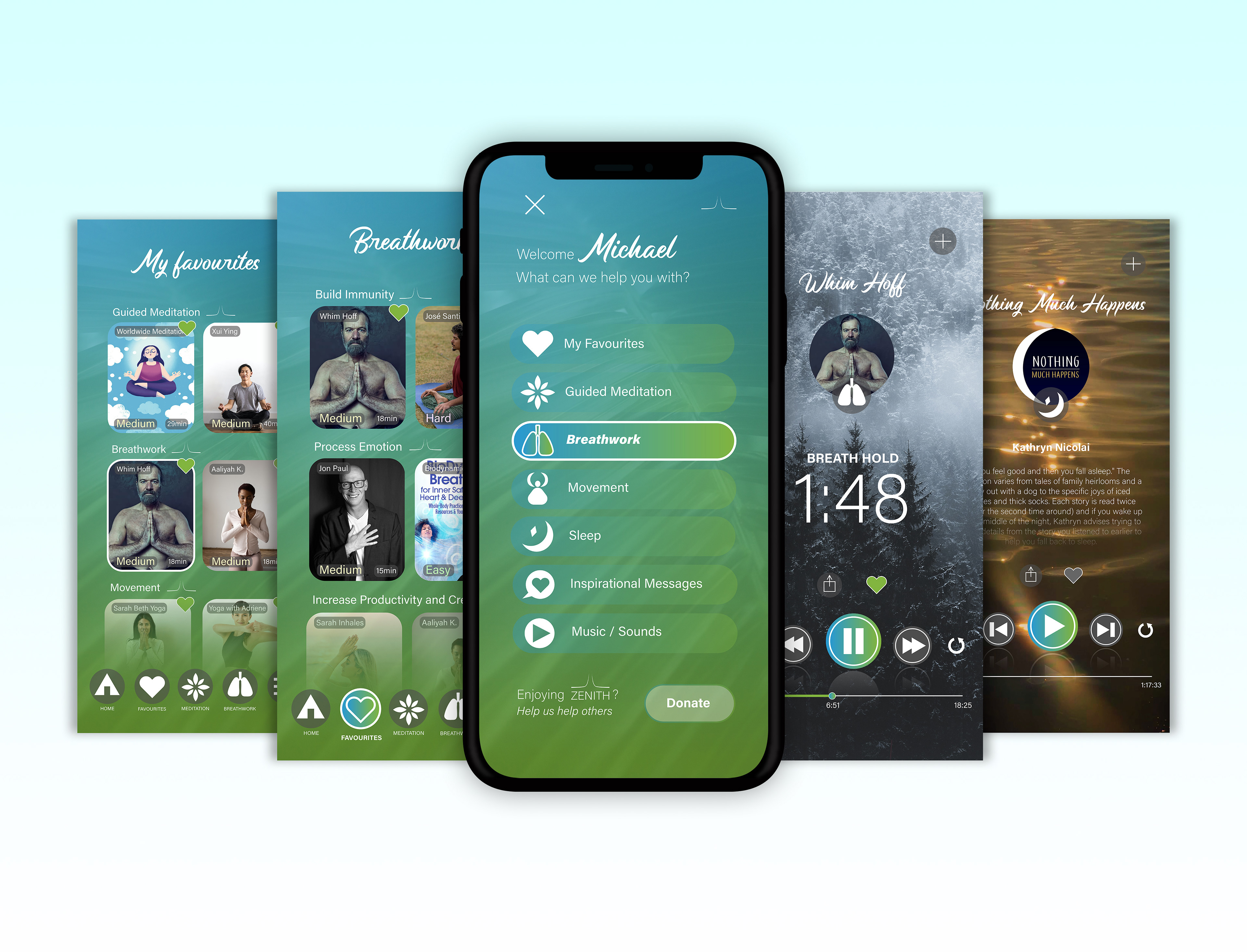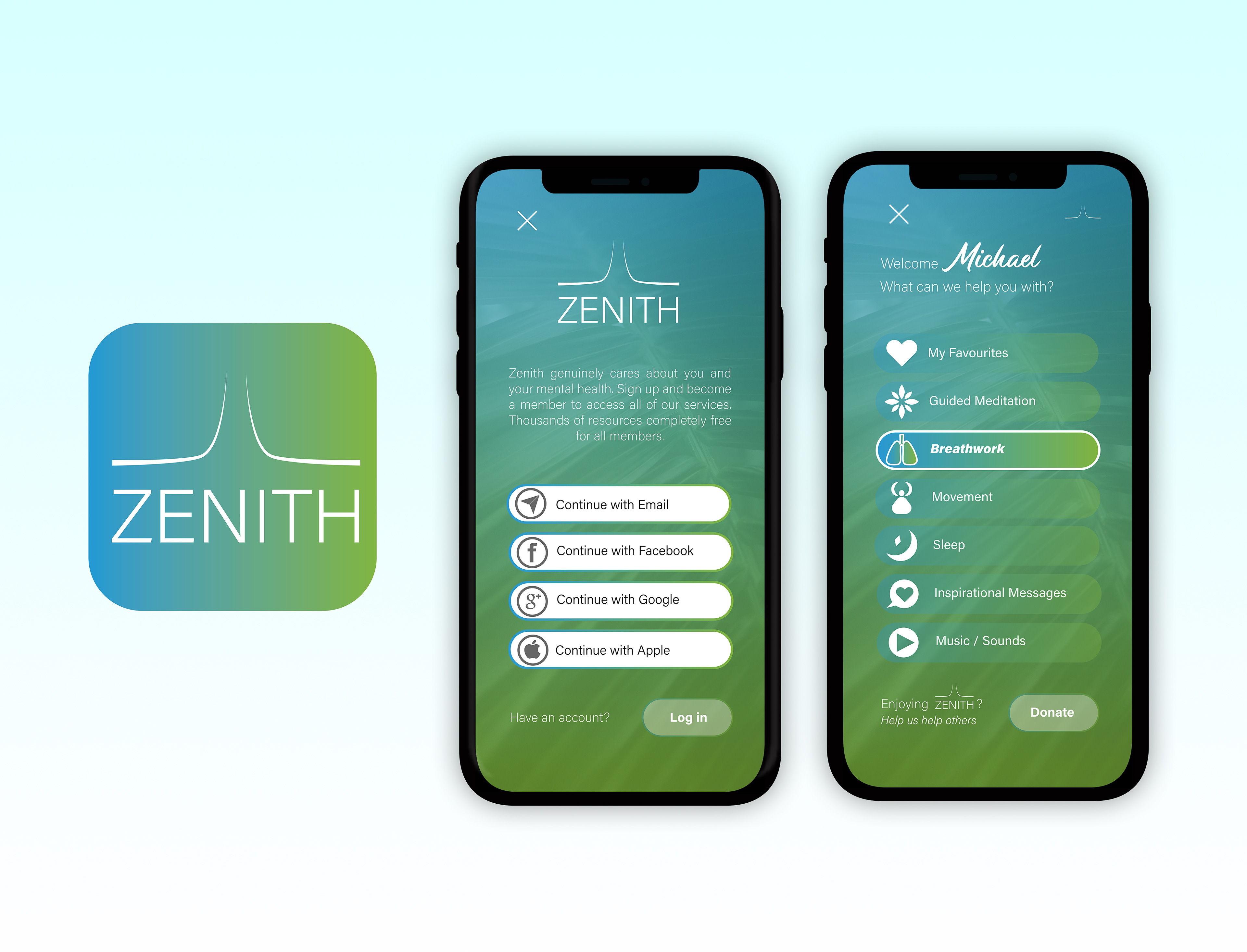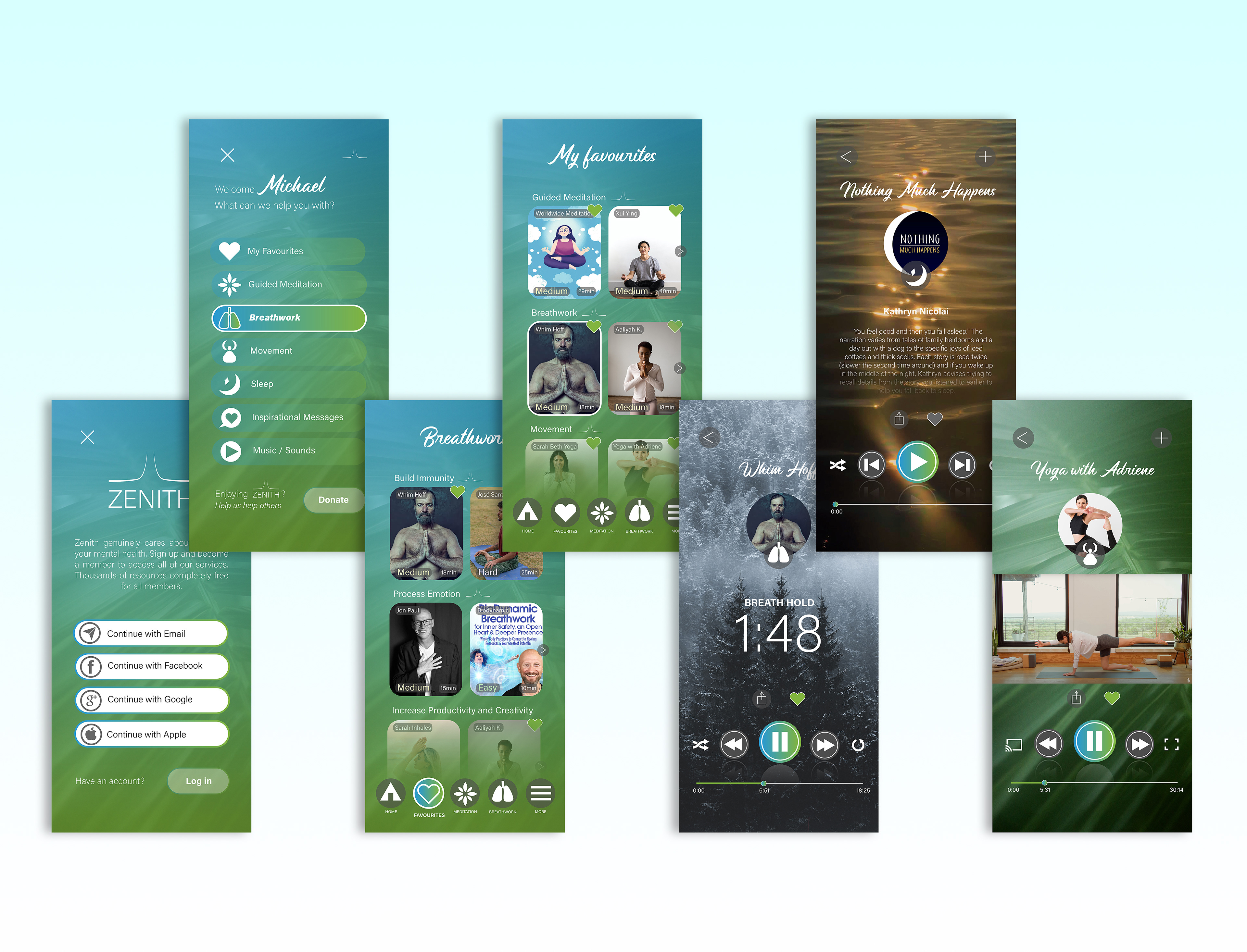 My solution involved developing a calming theme for the user interface. I utilised a harmonious blue and green visual system as the colours associate with nature, tranquility, and stability. I incorporated captivating nature photography into the design as natural environments tend to evoke feelings of peace and relaxation. I meticulously maintained consistency across all interface elements to ensure a pleasant user experience.